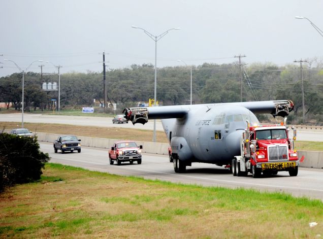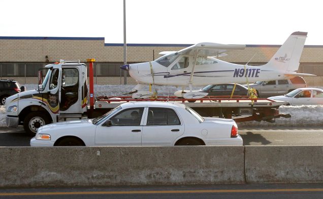 Um pequeno avião do departamento de justiça dos Estados Unidos sendo levado pela rodovia Insterstate 80, em Nova Jersey (2011).